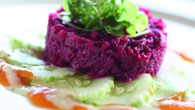 1. Preheat oven to 180C. Sprinkle sea salt onto a baking tray, place beetroot on top and cook in oven for 45 minutes. Allow to cool, then peel and cut into fine cubes.
