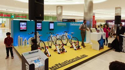 To get you ready for #cycletoworkuae, The National has set up a booth in front of Géant grocery store in Yas Mall until Monday. At this stand shoppers are invited to cycle on stationary bikes and compete to burn the most calories. Star FM is broadcasting live in the evenings and there are prizes to be won.