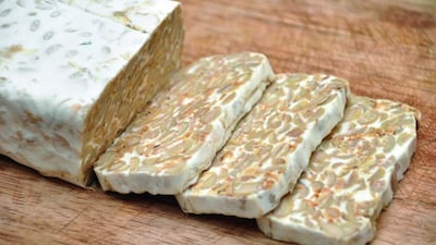 4. Tempeh, a soy product traditionally from Indonesia, made from cooked and slightly fermented soybeans that are formed into a burger-like patty.