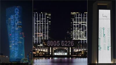 The message, along with the number to call to help, was shared on the Galleria Mall on Al Maryah Island, the Andaz Capital Gate building and the Adnoc headquarters on Abu Dhabi’s Corniche.
