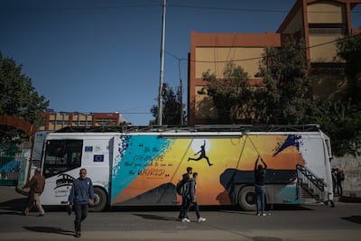 Palestinians attend a movie screening at an old house in central Gaza city. The closure of cinemas forced many residents to seek other ways of viewing and screening films. A new cinema bus, which can accommodate up to 50 passengers and recreates the experience of stepping into a cinema hall, offering residents of all ages an opportunity to once again be immersed in the cinema experience.