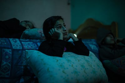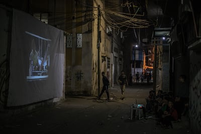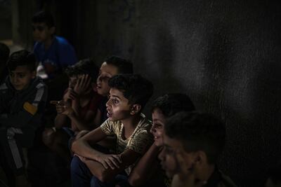 Palestinian children attend a movie screening in the street in Jabalia refugee camp, Gaza city.