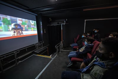 Palestinian children watch a film inside a cinema bus in Gaza city.