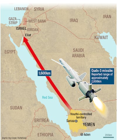 The group's longest-range missile, the Quds-3, has a claimed range of 2,000km and is the only type capable of flying to Eilat.