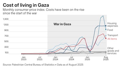 However, that didn't last long for housing expenses, which in just two months reached a CPI of 1,018 and have remained constant, but costs could increase again given Israel's eviction order for all of Gaza city at the start of September. Additionally, accessing food has become a challenge for Gazans, and the CPI of food is another perspective on the crisis they have been confronting, peaking at 1,468 in July 2025, its highest level in the past decade, adding to the current famine in Gaza.