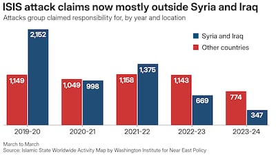 The data makes one thing clear. ISIS has declined as a force in Syria and Iraq, and has adapted, decentralised and shifted its focus elsewhere. The strategy today appears to be less about holding territory and more about attacks by lone actors, regional affiliates and a movement that continues to project influence far beyond the Middle East.