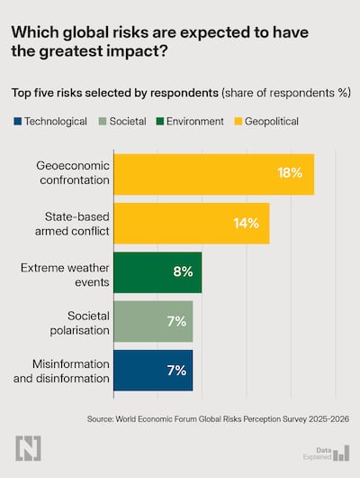 Geo-economic confrontation jumped eight places compared with last year’s report. State-based armed conflict ranked second for 2026 but fell to fifth place in the two-year outlook, suggesting that, while wars remain a dominant concern, their economic spillovers are becoming more central.