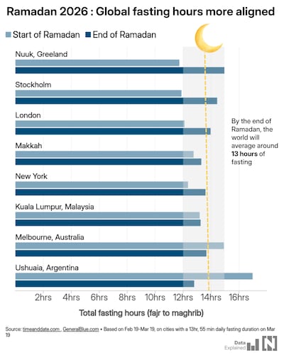 By the end of Ramadan, fasting durations in cities as diverse as London, Makkah, New York and Kuala Lumpur come much closer together. On average, Muslims worldwide will fast for around 13.7 hours a day by March 19. The pattern reflects the 33-year cycle of the Islamic calendar and shows how the starting date of Ramadan can significantly shape the daily experience of fasting from year to year.