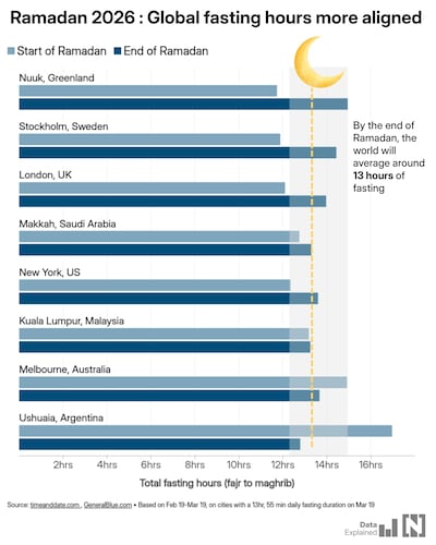 By the end of Ramadan, fasting durations in cities as diverse as London, Makkah, New York and Kuala Lumpur come much closer together. On average, Muslims worldwide will fast for around 13.7 hours a day by March 19. The pattern reflects the 33-year cycle of the Islamic calendar and shows how the starting date of Ramadan can significantly shape the daily experience of fasting from year to year.