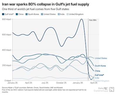 After the start of co-ordinated US-Israeli air strikes against Iran on Feb 28 and Tehran’s retaliatory strikes, shipping traffic via Hormuz, which supplies a fifth of the world’s oil, came to a halt. Before the war, Gulf states accounted for up to 32 per cent of the world’s jet fuel supply. The region's share of global jet fuel supply collapsed to 8.2 per cent in March and a mere 3.7 per cent in April.