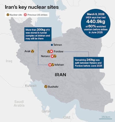 The IAEA estimates that when Israel launched its first attacks in June 2025, Iran had 440.9kg of 60 per cent uranium kept at nuclear plants nationwide. The agency tracked a convoy removing what was thought to be a substantial amount from another site – Fordow – shortly before last year's 12-day aerial war. Another batch of the enrichment material is believed to be stored at the Natanz nuclear plant. Only a short cycle of further enrichment is necessary to provide the explosive feedstock needed for 10 nuclear weapons, according to an IAEA yardstick.