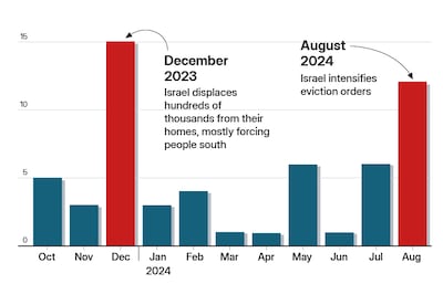 An investigation by The National's special projects and data journalism team has logged 60 eviction orders issued by the Israeli military, detailing a pattern of continuous forced displacement and chaos in Gaza.