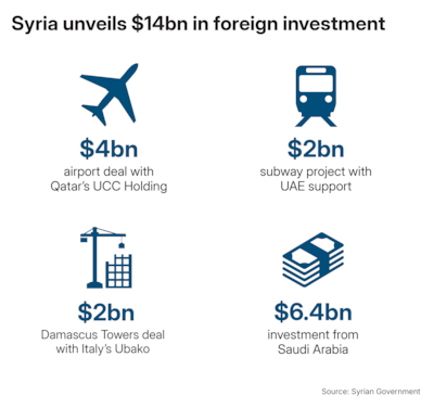 The plans include a $4 billion agreement for Damascus airport with Qatar's UCC Holding; a deal worth more than $2 billion for a mall and two towers, signed with Italy-based construction company Ubako; and $2 billion for a Damascus metro system.