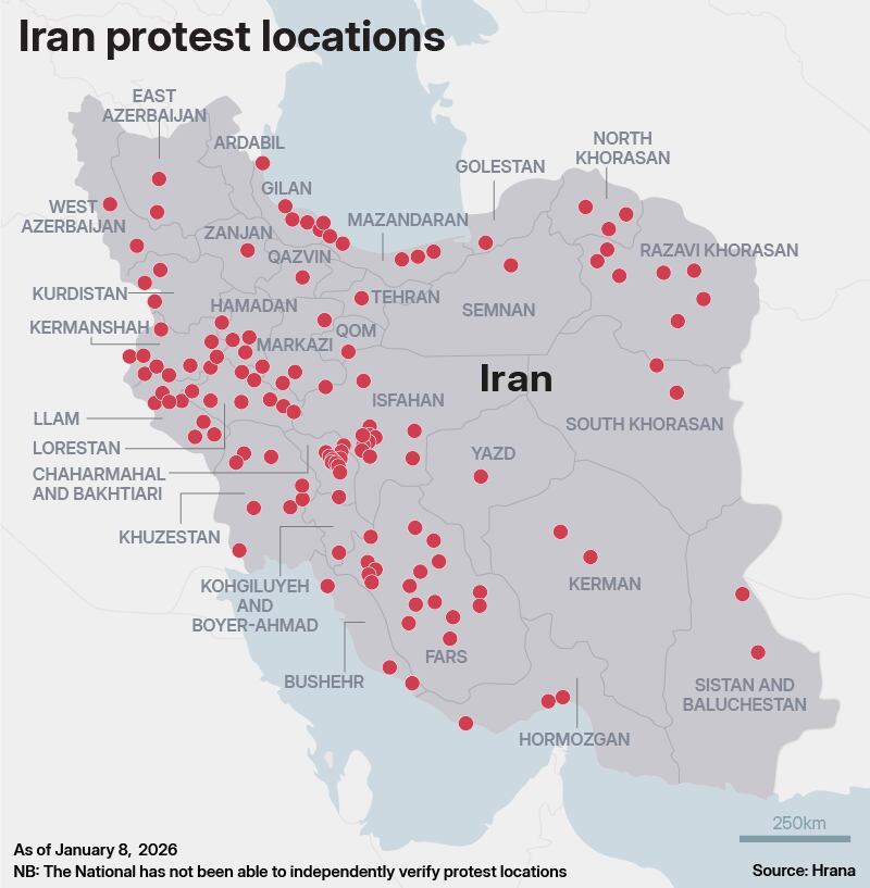 Hrana data relies on the work of activists inside and outside the country. The National is not able to independently verify the tallies and Iran does not publish an official number of those killed in the demonstrations and surrounding chaos.