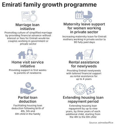 Emiratis who take part in the programme can receive financial loans, rent assistance for up to four years and housing loan deductions after the births of their fourth, fifth and sixth child.