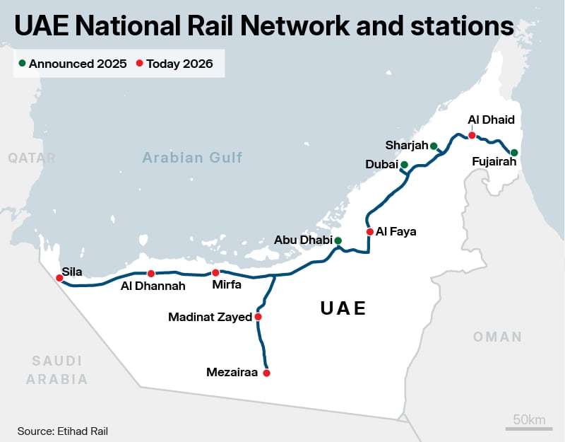 Azza Al Suwaidi, deputy chief executive of Etihad Rail Mobility, said the network will serve as a “cornerstone of the UAE’s national transport ecosystem, supporting the country’s long-term development and strengthening connectivity across its Emirates”.