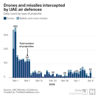 The UAE Armed Forces have dealt with 17 ballistic missiles and 35 drones since the US-Iran ceasefire was agreed, the Ministry of Defence said on Wednesday.