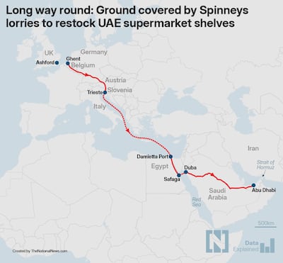 With no clear progress towards secure passage through the Strait of Hormuz, supermarkets have turned to longer road routes to import UAE goods.