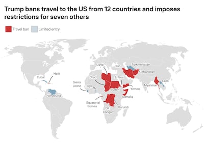 The countries facing the total ban were found “to be deficient with regards to screening and vetting and determined to pose a very high risk to the United States", the White House said. Mr Trump said the travel ban from his first term was one of his most successful policies and “key” to preventing terrorist attacks on American soil.