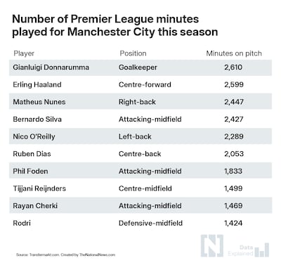 Only four players have been on the pitch more than O'Reilly's 2,289 minutes, with the 1.93m-tall player – who was predominantly a midfielder or No 10 during his years in City's academy – becoming a vital component in the Guardiola machine.