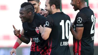 Images from Al Ahli's 4-0 win over Emirates club on Saturday in the Arabian Gulf League, as Asamoah Gyan scored early into his first league match back in the UAE and the Dubai giants added a flurry of late goals to round out the tally.