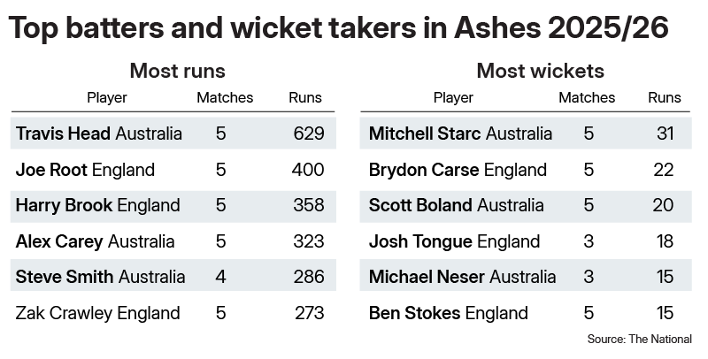 Joe Root scored two centuries, Harry Brook got a start in every innings bar one, to be among the top three. Brydon Carse was the second-highest wicket-taker in the series with 22 scalps – although his average of 30 was high – and was only behind the outstanding Mitchell Starc with 31 wickets. Josh Tongue and Ben Stokes both took 15 wickets apiece. But most of it did not matter in the decisive moments of the series.