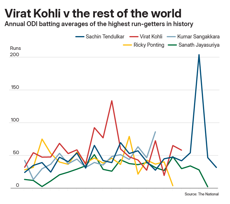 In ODIs, Kohli (14,673) is a fair way behind Tendulkar (18,426). A gap of almost 4,000 runs even at Kohli’s current average of 60 will take well over 60 matches to overcome.
