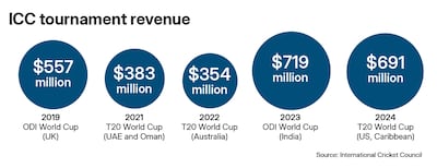 Both the 2024 T20 World Cup and the 2023 ODI World Cup brought in revenues in the range of $700 million ($691m and $719m respectively), according to the ICC's annual report.