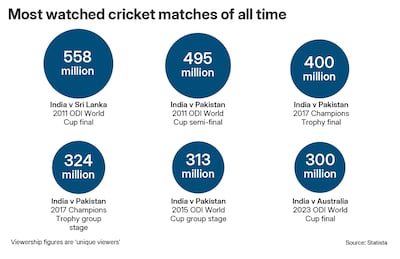 However, according to verifiable figures, India's matches at World Cups in general tend to bring in the biggest numbers. The most-watched cricket match of all time was the 2011 World Cup final between India and Sri Lanka, which attracted a little over half a billion unique viewers (558 million). India's win over Pakistan in the semi-final of that tournament is second on the list at a little under half a billion (495m).