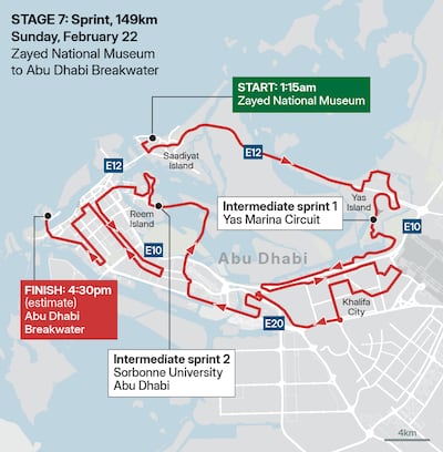 Stage 7: Sunday, February 22 – AD Ports Group Stage (149km sprint) Zayed National Museum to Abu Dhabi Breakwater. Starts: 1.15pm; Estimated finish: 4.30pm.