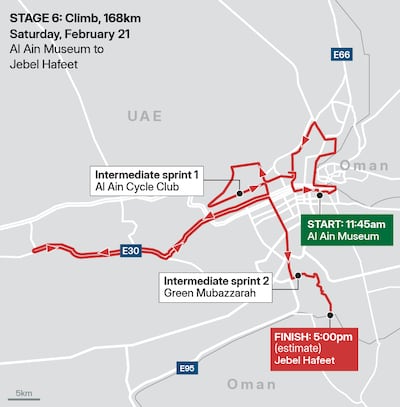 Stage 6: Saturday, February 21 – Burjeel Holdings Stage (168km climb). From Al Ain Museum to Jebel Hafeet. Starts: 1pm; Estimated finish: 5pm.