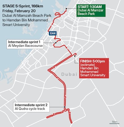Friday's Stage 5 is a 166km route around Dubai ending with an expected sprint finish at Hamdan Bin Mohammed Smart University.