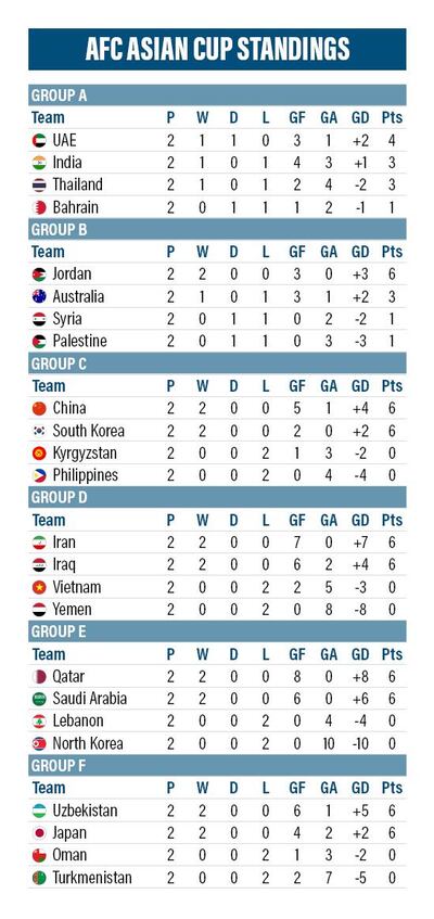 Monday night's 1-1 draw in Al Ain means the UAE secured first place in the group with five points, one ahead of Thailand and Bahrain, who also both reached the last 16 of the continental showpiece. Bahrain beat India 1-0 in their final match.