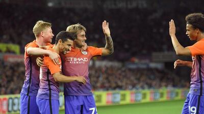 Images from Manchester City's 2-1 win over Swansea City in the League Cup on Wednesday night, as orange-and-dark-blue clad City in their alternate kit got goals from Aleix Garcia and Gael Clichy to progress.