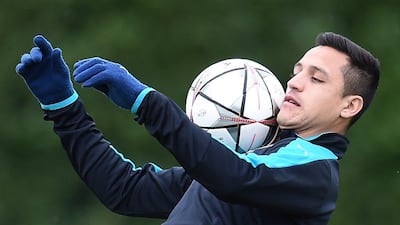 Arsenal's Chilean striker Alexis Sanchez is pictured as he takes part in a training session ahead of the UEFA Champions League round of 16 1st leg football match against Barcelona at Arsenal's London Colney training ground on February 22, 2016. Arsenal will play against Barcelona at the Emirates Stadium in London on Tuesday February 23, 2016. / AFP / GLYN KIRK