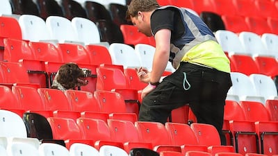 A steward evacuates fans from the ground prior to the Premier League match between Manchester United and AFC Bournemouth at Old Trafford on May 15, 2016 in Manchester, England. (Alex Livesey/Getty Images) -