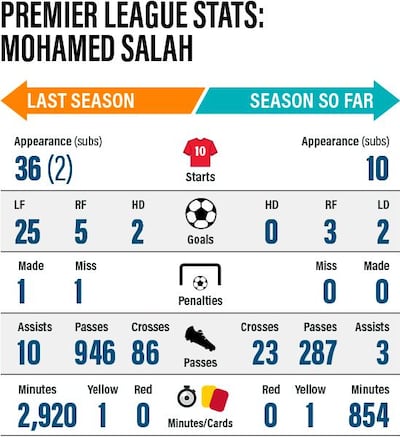 Another statistic worth looking at is what the Premier League classes as "big missed chances". Salah had 23 of these in 36 appearances last season - that's 0.64 per game. This time around he is averaging 0.6 per game having missed six from 10 matches.