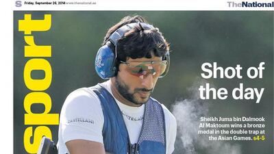 The National’s Sport cover for the Friday, September 26 issue, features Sheikh Juma bin Dalmook Al Maktoum, who won the bronze medal for the UAE in the double trap shooting event at the Asian Games in South Korea. It was the first medal for the UAE at these Asian Games.