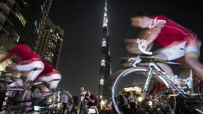 Cyclists make their way down a bridge as part of the opening ceremony for the Dubai Tour on Tuesday. Sarah Dea / The National -