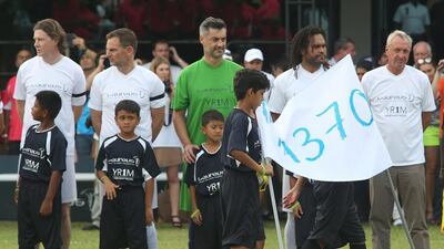 Images of coaches Johan Cruyff, Fabio Capello, players Hidetoshi Nakta, Jari Litmonen and others from the Laureus All Stars Unity Cup football match at the Royal Selangor Club in Kuala Lumpur, Malaysia on Tuesday.