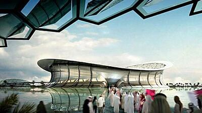 It turns up in the little glass cases showing designs for 12 stadiums -right down to the miniature palm trees and cars - with names such as Umm Slal, Qatar University, Doha Port, Al-Khor, Al-Shamal, Al-Wakrah, Education City, Al-Rayyan, Al-Gharafa and Lusall Iconic.