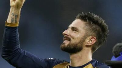 Arsenal striker Olivier Giroud celebrates on The National Sport front page on Monday, December 14 after helping his side to victory over Aston Villa and with it to the top of the Premier League table.