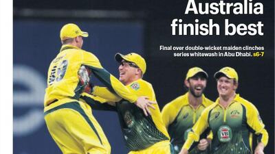 The National’s Sport cover of the Monday, October 13 issue, featuring Australia’s double-wicket maiden final over to clinch a one-day series whitewash over Pakistan in Abu Dhabi.