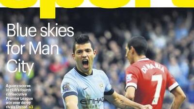 The National’s Sport cover for the Monday, November 3 issue, featuring Sergio Aguero and a victorious Manchester City side in the Manchester derby on Sunday at the Etihad Stadium.