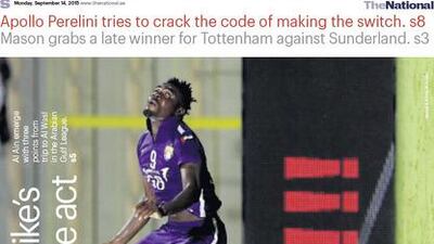 Nigerian striker Emmanuel Emenike backflips his way onto The National Sport front page on Monday, September 14 after his double led Al Ain to victory against Al Wasl.