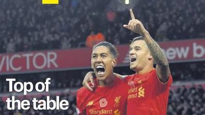 Roberto Firmino, Philippe Coutinho and Liverpool are on The National's Sport cover for Monday, November 7, as they went top in the Premier League.