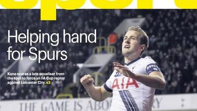 Harry Kane jumps for joy on The National Sport front page after scoring a late penalty to secure Tottenham a dramatic draw against Leicester City in the FA Cup third round.