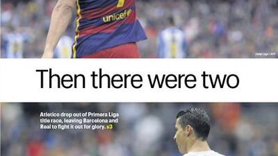 The National's Sport cover for the Monday, May 9 issue, featuring Luis Suarez, Cristiano Ronaldo, Barcelona and Real Madrid as they were left the lone La Liga title chasing teams.