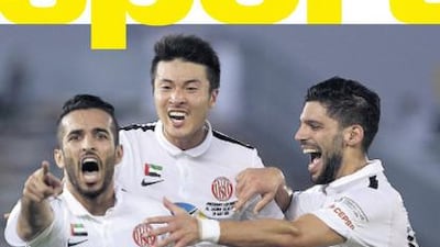 Al Jazira players celebrate on The National Sport front page on Monday, May 30 after defeating Al Ain on penalties to clinch the President's Cup.