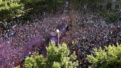 Thousands of fans took to the streets of Barcelona on Sunday to celebrate their club's fifth Champions League win, decking the Catalan capital out with flags, shirts, scarves and confetti. Luis Suarez, who scored the decisive goal in the 3-1 defeat of Juventus, Neymar, Lionel Messi, and the rest of the team rode a bus to Camp Nou where a crowd of 67,000 were awaiting them.